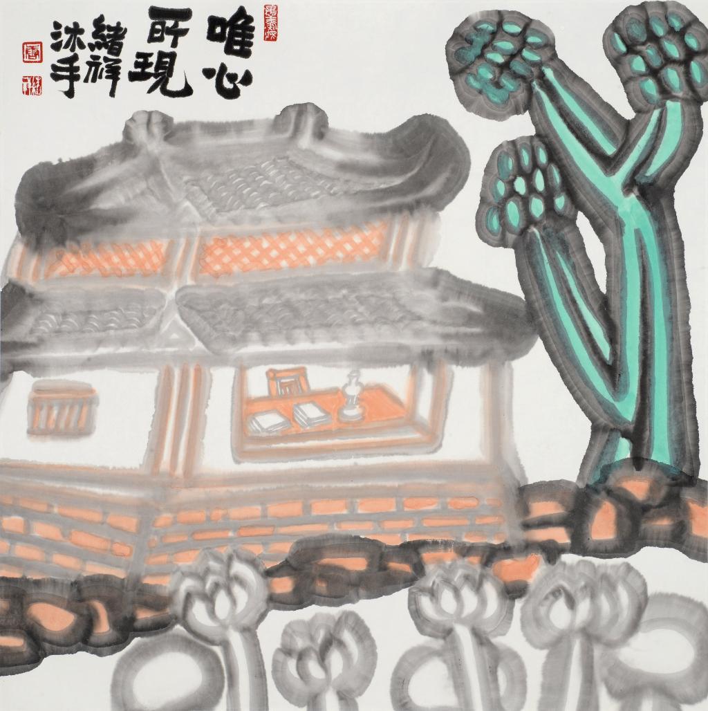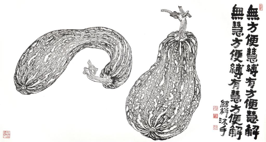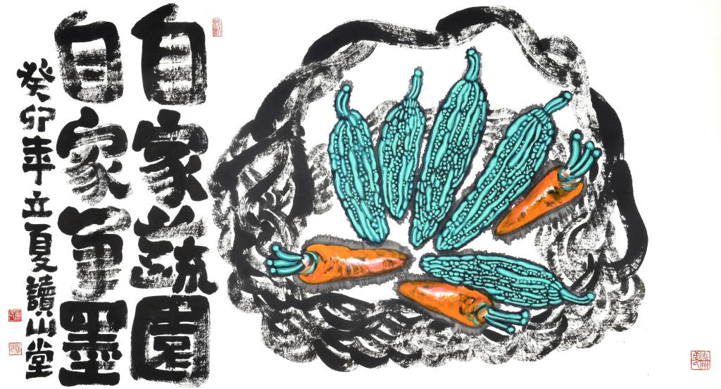 唐绪祥具有掌控水墨纸张等传统画材的高超能力,并将传统绘画中以诗书画印来经营位置的形式特质精准呈现。其画作的最妙之处在于墨与色的使用布置:山水重墨,在浓与淡中成就层次分明的山石树屋。尤其喜欢以重墨为山造型,呈现为浓黑的面;以淡墨勾出楼阁花树,呈现为清淡有序的线;又在水墨的洇渗中,融合出既有强烈对比而又柔和统一的黑白灰关系,真正做到墨分五色;偶以石绿染树、赭红着墙,由粉绿砖红点缀黑白灰的纯粹,因此更添缤纷趣味。蔬果重色,往往是墨线为廓,以斑斓重彩染就画中果蔬。其惯用粉绿、玫红和浓重的黄,在客观自然的基础上,恣意夸张。咧嘴的石榴、斑驳的苦瓜、茄子青椒、青红萝卜等,都处理得多彩炫目。画中图文互补,多以大字点题并填充空白,字形质朴方拙,金石意味浓厚,因此更具装饰意味。唐绪祥曾师从李可染、白雪石、张仃诸先生研习山水绘事,又深耕金工数载,这让他的绘画作品既有传统绘画的笔墨精神,又呈现出深厚的工艺美术功底,成为当代艺术家重新阐释传统艺术的一个典型案例。